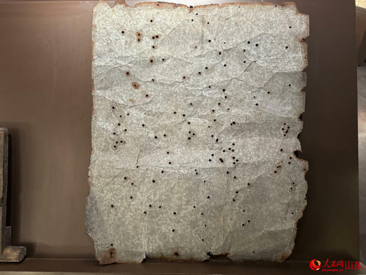 生栩然帶記者來(lái)到一塊布滿彈孔的鐵皮旁,“這是一塊鐵皮雨搭子,在這塊不足0.8平方米的鐵皮雨搭子上布滿了138個(gè)彈孔。1938年的2月13日,中共膠東特委室率部攻克牟平城后,在雷神廟研究下一步行動(dòng)時(shí)遭到了日軍的包圍,他們憑借著劣勢(shì)武器,打退了數(shù)倍于己的敵人,打死打傷了日軍50余人,成功實(shí)現(xiàn)了突圍,打響了膠東抗戰(zhàn)的第一槍。”