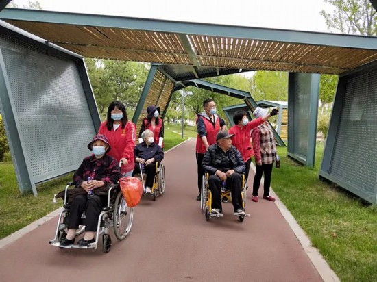 經(jīng)開區(qū)勝利街道勝宏社區(qū)“一米陽光 助愛出行”服務(wù)隊陪同行動不便的老年人出門看風(fēng)景。