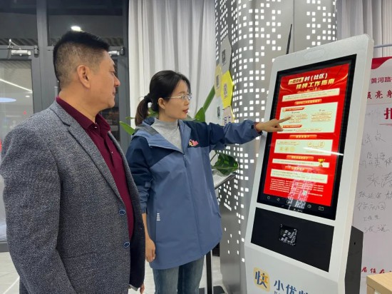 東營區(qū)燕山社區(qū)黨委書記劉臣臣向社區(qū)居民講解村社區(qū)掛牌工作指南。