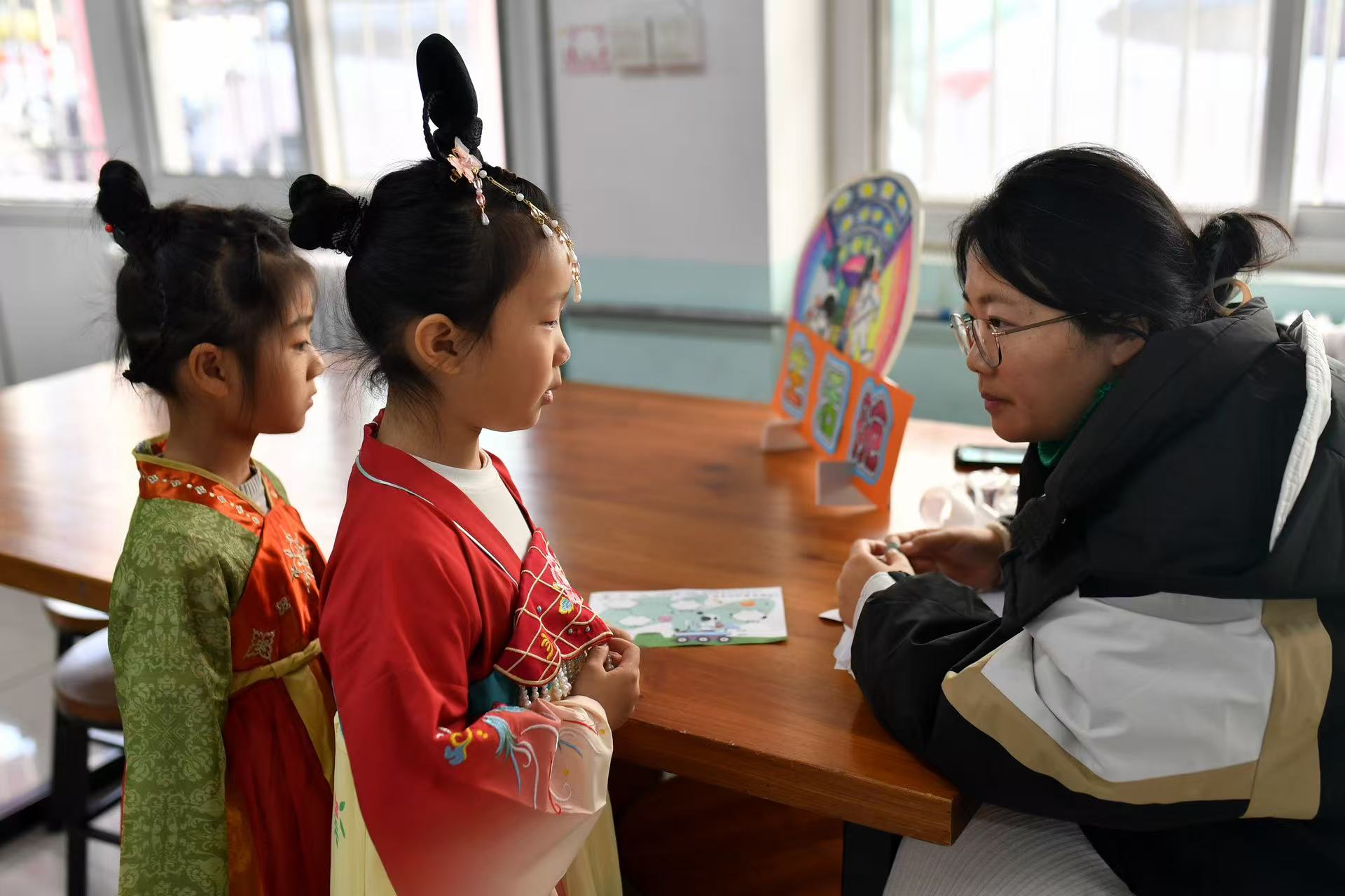 兩名穿戴漢服的小朋友在“生活艙”回答問題。