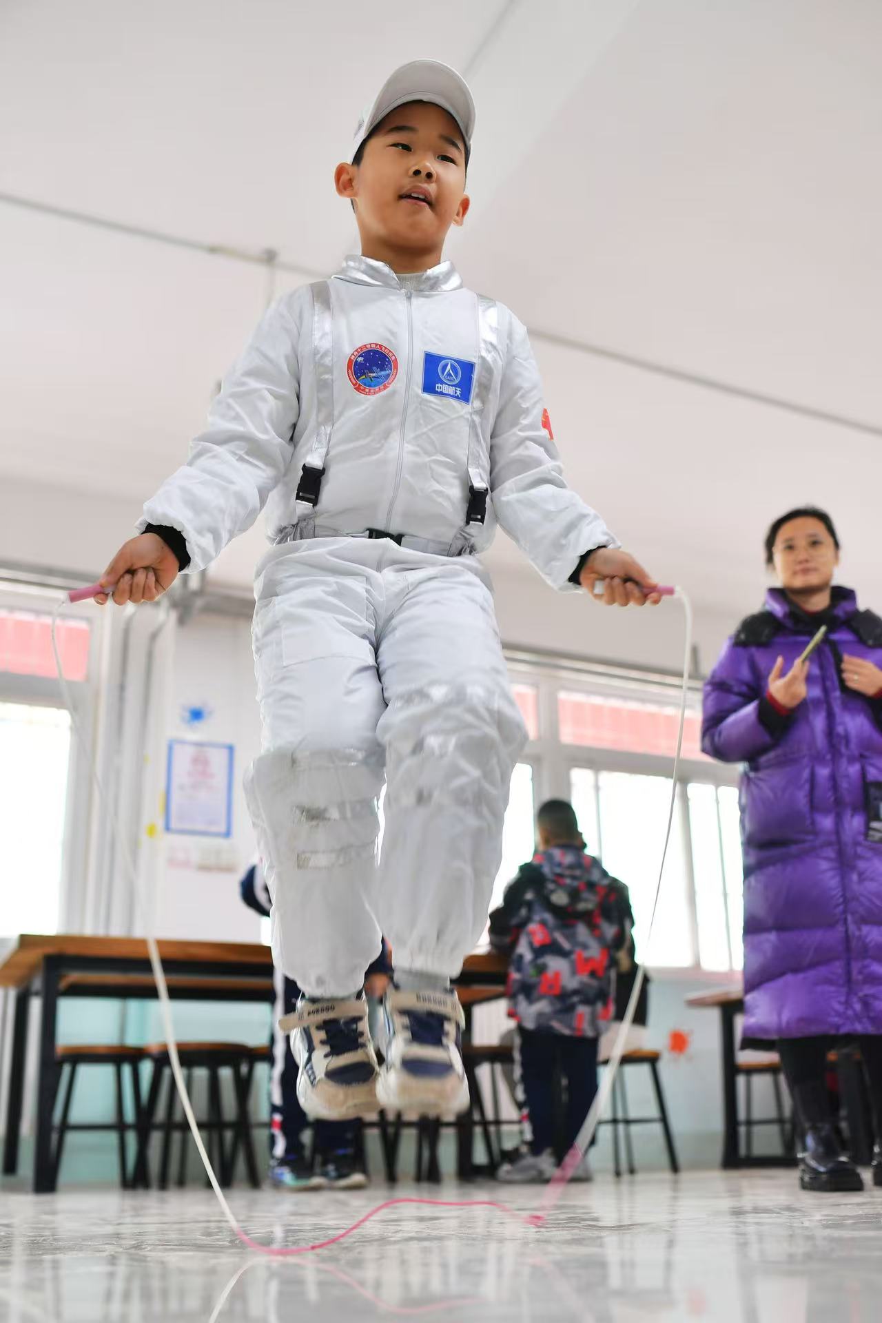 2025年1月7日,在山東青島北仲路第二小學開展的期末綜合評價科普主題活動上,三名穿戴宇航服的小朋友來到“實驗艙”進行測評。
