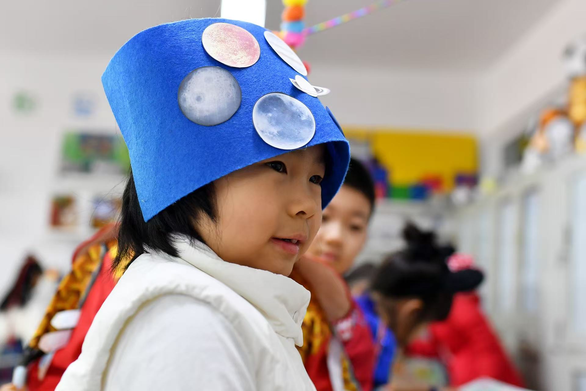 一名小朋友用星球頭飾裝扮自己。