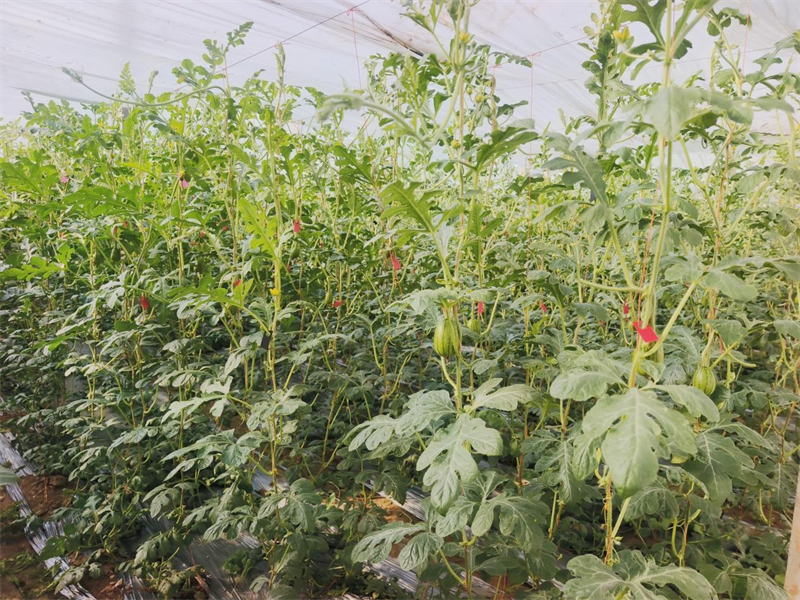 “種棚絕對(duì)是個(gè)技術(shù)活,要結(jié)合土壤、水等自然條件不斷鉆研,種出來(lái)的瓜才會(huì)更甜。我們提前施撒了有機(jī)肥,并根據(jù)瓜苗不同的生長(zhǎng)階段和生長(zhǎng)環(huán)境,適時(shí)調(diào)整滴灌頻率和用水量,保證西瓜的生長(zhǎng)維持在最佳狀態(tài)??纯次覀冞@瓜,現(xiàn)在已經(jīng)和小孩的拳頭一樣大了,再有一個(gè)多月就能讓大家吃上又甜又脆的西瓜了,到時(shí)候肯定能賣(mài)個(gè)好價(jià)錢(qián)?!瘪R勝利自信滿滿地說(shuō)道。