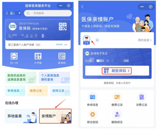 進(jìn)入國家醫(yī)保服務(wù)平臺(tái)→親情賬戶,選擇綁定的家庭成員,點(diǎn)擊刷醫(yī)保碼。