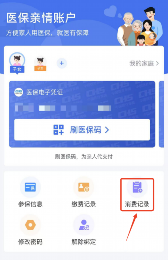 進(jìn)入國家醫(yī)保服務(wù)平臺(tái)→親情賬戶,選擇綁定的家庭成員,點(diǎn)擊“消費(fèi)記錄”即可查詢。