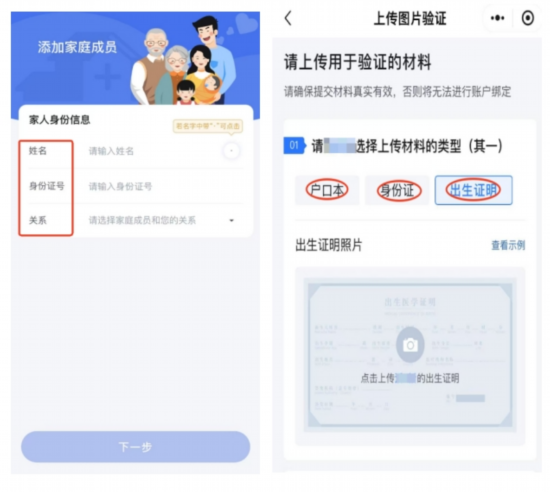 第四步:填寫需綁定的家庭成員信息,上傳驗(yàn)證材料(戶口本、身份證、出生證明選其一)。