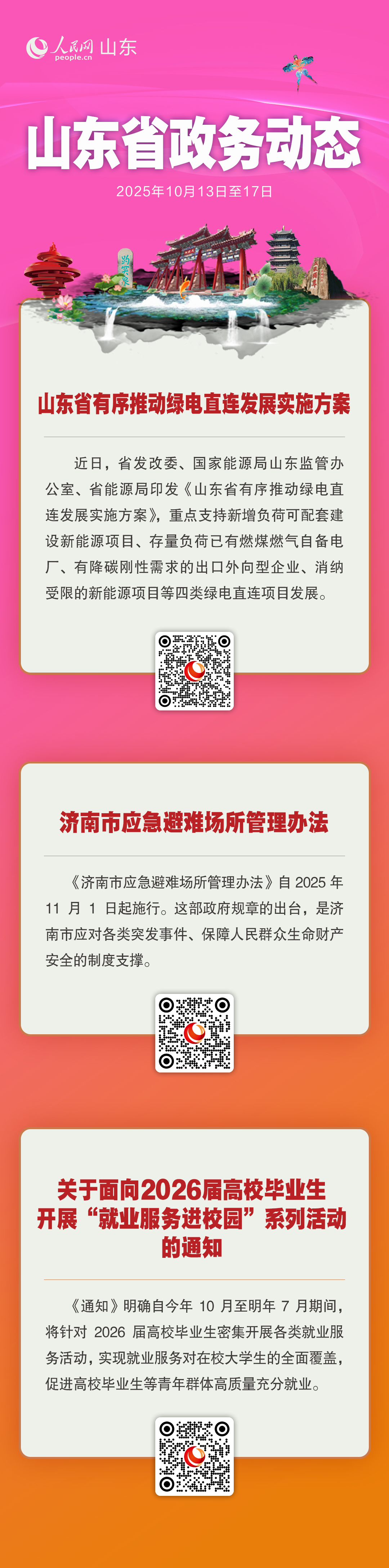 本周(10月13日至10月17日)山東出臺(tái)《山東省有序推動(dòng)綠電直連發(fā)展實(shí)施方案》《濟(jì)南市應(yīng)急避難場(chǎng)所管理辦法》《關(guān)于面向2026屆高校畢業(yè)生開展“就業(yè)服務(wù)進(jìn)校園”系列活動(dòng)的通知》,具體如下: