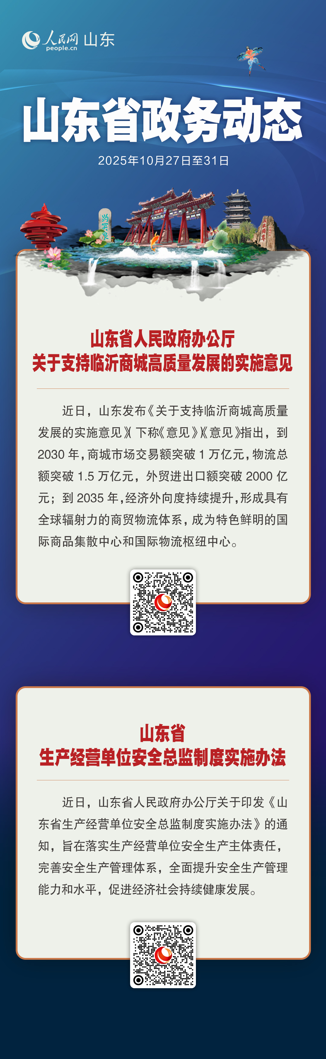 本周(10月27日至10月31日)山東出臺《關于支持臨沂商城高質量發(fā)展的實施意見》《山東省生產經營單位安全總監(jiān)制度實施辦法》,具體如下: