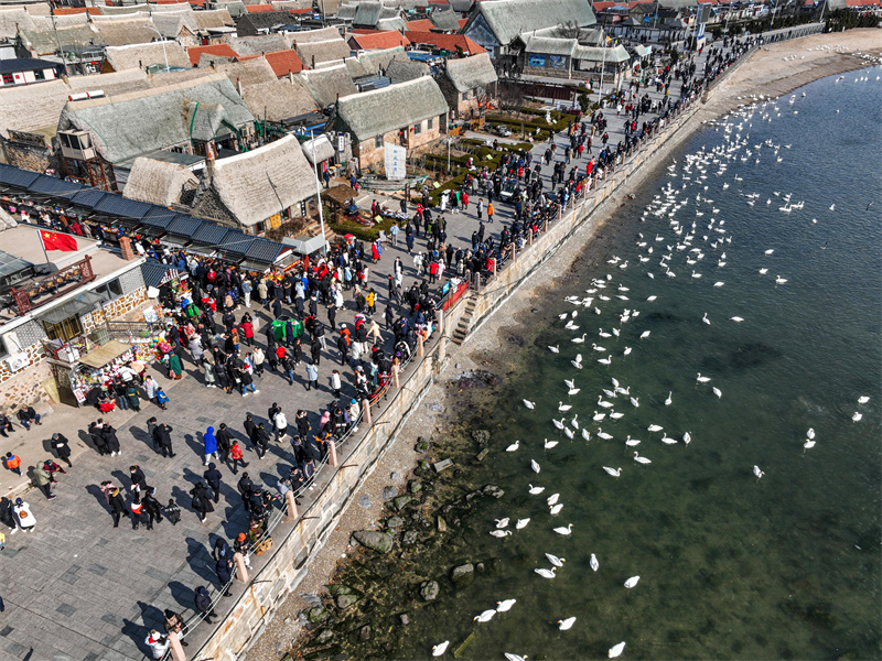 如今,“看天鵝,到榮成”已經(jīng)成為冬季旅游的熱門選擇。每年冬季,數(shù)以十萬計(jì)的游客和攝影愛好者慕名而來,帶火了當(dāng)?shù)氐摹疤禊Z經(jīng)濟(jì)”。民宿一房難求,餐飲、零售等行業(yè)持續(xù)升溫。俚島鎮(zhèn)煙墩角村更是乘勢而起,發(fā)展出“夏游牧場、冬賞天鵝、住海草房、吃漁家飯”的生態(tài)旅游產(chǎn)業(yè)體系,2024年,入選聯(lián)合國旅游組織2024年最佳旅游鄉(xiāng)村。