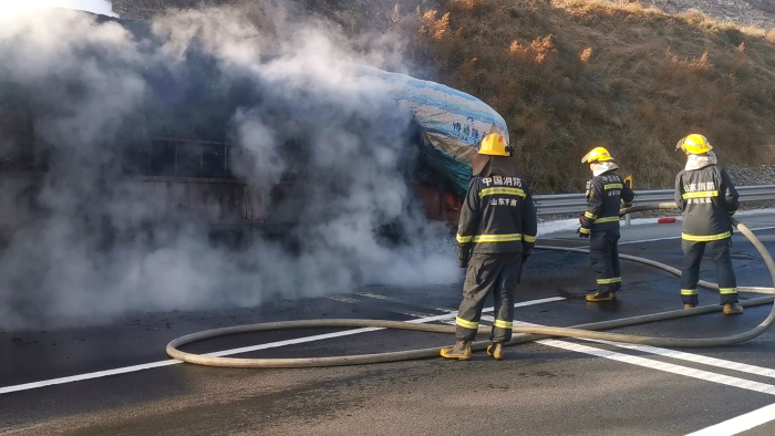 2025年11月18日08時19分,濟(jì)南市消防救援支隊(duì)指揮中心接到報警稱:位于平陰縣玫瑰鎮(zhèn)青蘭高速423公里處有輛半掛車在行駛途中起火,情況十分緊急,需消防救援人員到場處置。接指揮中心調(diào)度命令后,濟(jì)南市消防救援支隊(duì)玫城消防救援站出動2車14人趕往現(xiàn)場進(jìn)行處置。