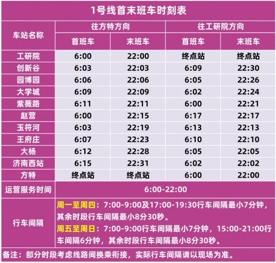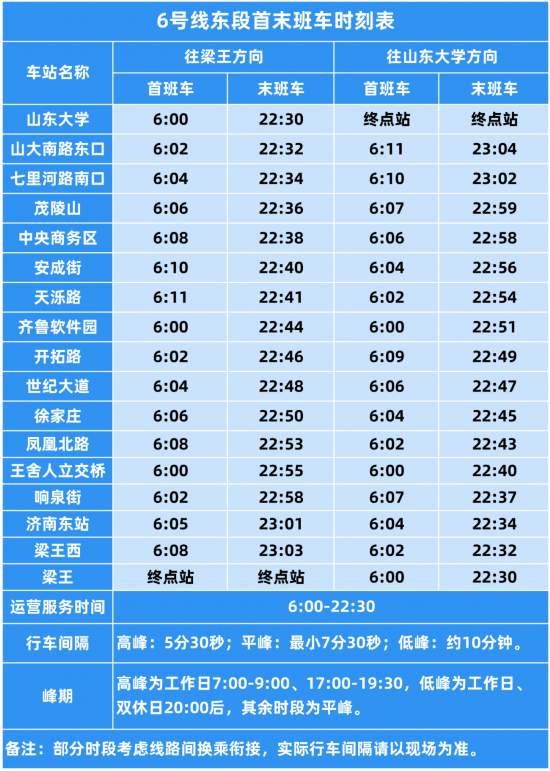 6號(hào)線東段行車(chē)間隔為工作日高峰5分30秒、平峰最小7分30秒、低峰約10分鐘,雙休日行車(chē)間隔與工作日平峰低峰時(shí)段一致。此外,4、8號(hào)線和6號(hào)線東段開(kāi)通后,1、2、3號(hào)線列車(chē)的到發(fā)時(shí)刻、停站時(shí)間均有調(diào)整。您可通過(guò)“濟(jì)南地鐵”App查詢(xún)?nèi)炝熊?chē)到站時(shí)刻,合理規(guī)劃出行行程。