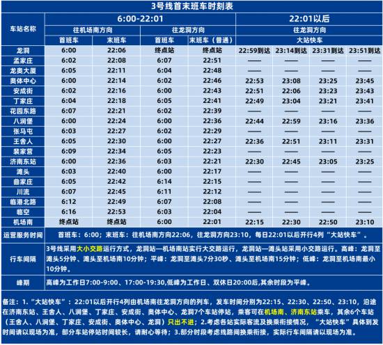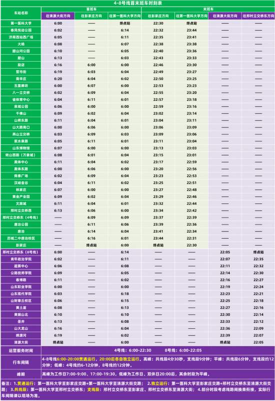 運(yùn)營(yíng)服務(wù)時(shí)間,新線開(kāi)通運(yùn)營(yíng)后,濟(jì)南地鐵線網(wǎng)既有1、2、3號(hào)線,運(yùn)營(yíng)服務(wù)時(shí)間基本保持不變,新線運(yùn)營(yíng)服務(wù)時(shí)間差異化延長(zhǎng),4號(hào)線、6號(hào)線東段運(yùn)營(yíng)服務(wù)時(shí)間為6:00-22:30;8號(hào)線運(yùn)營(yíng)服務(wù)時(shí)間為6:00-22:05。