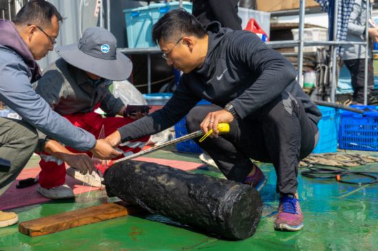 水下考古隊員在測量剛出水的“靖遠”艦21厘米克虜伯炮彈。